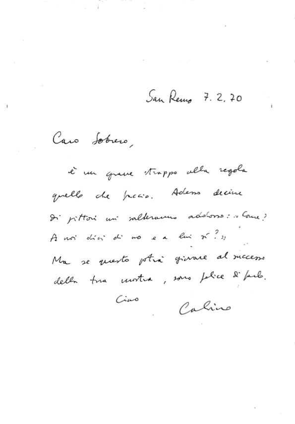 Nel 2023 l’Archivio Ettore Sobrero e’ stato invitato ad esporre 4 opere dell’artista presso il Palazzo Ducale di Genova, nel contesto della mostra “Calvino Cantafavole”. Le opere sono presenti nel catalogo della mostra edito da Ed. Electa.