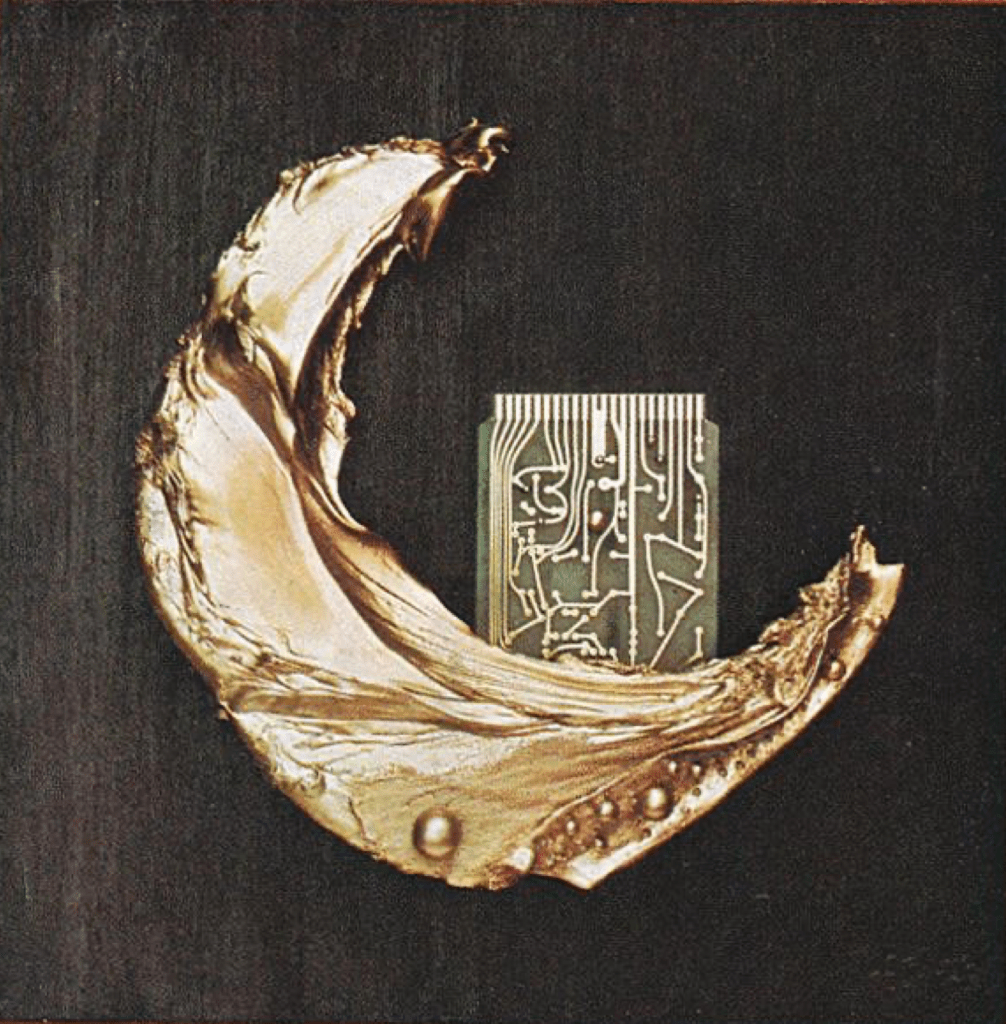 Sobrero ci ricorda anche questo. I suoi corpi vaganti, le loro forme, il loro moto, la loro durata, ci vengono incontro o si allontanano in uno spazio sul quale l’artista ha inciso in oro le trame di circuiti stampati, di patterns elettronici, come stemmi araldici.